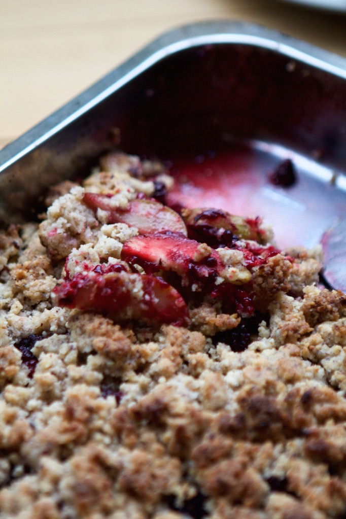 Crumble is wonderful. So easy, fast and crazy versatile. If you have no access to blackberries, just take any other berry, or replace the wheat trough finely grounded nuts. Its not getting easier than that. Low maintenance and looks like a bit of work